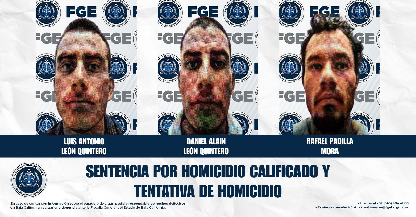 TIJUANA, BAJA CALIFORNIA. - La Coordinación de Averiguaciones Previas y Control de Proceso, adscrita a la Fiscalía Regional de Tijuana, obtuvo sentencia condenatoria de 50 años de prisión en contra de tres individuos por los delitos de homicidio calificado con premeditación, ventaja y alevosía, así como homicidio calificado en grado de tentativa, por hechos registrados el 9 de julio de 2014 en la colonia Obrera, Tercera Sección.