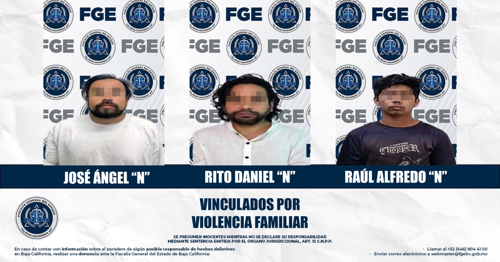 MEXICALI, BAJA CALIFORNIA. - Como resultado de la sólida integración de carpetas de investigación, la Fiscalía Regional de Mexicali obtuvo la vinculación a proceso de tres hombres acusados de ejercer violencia contra sus familias en incidentes distintos ocurridos en la capital del estado y el Valle.