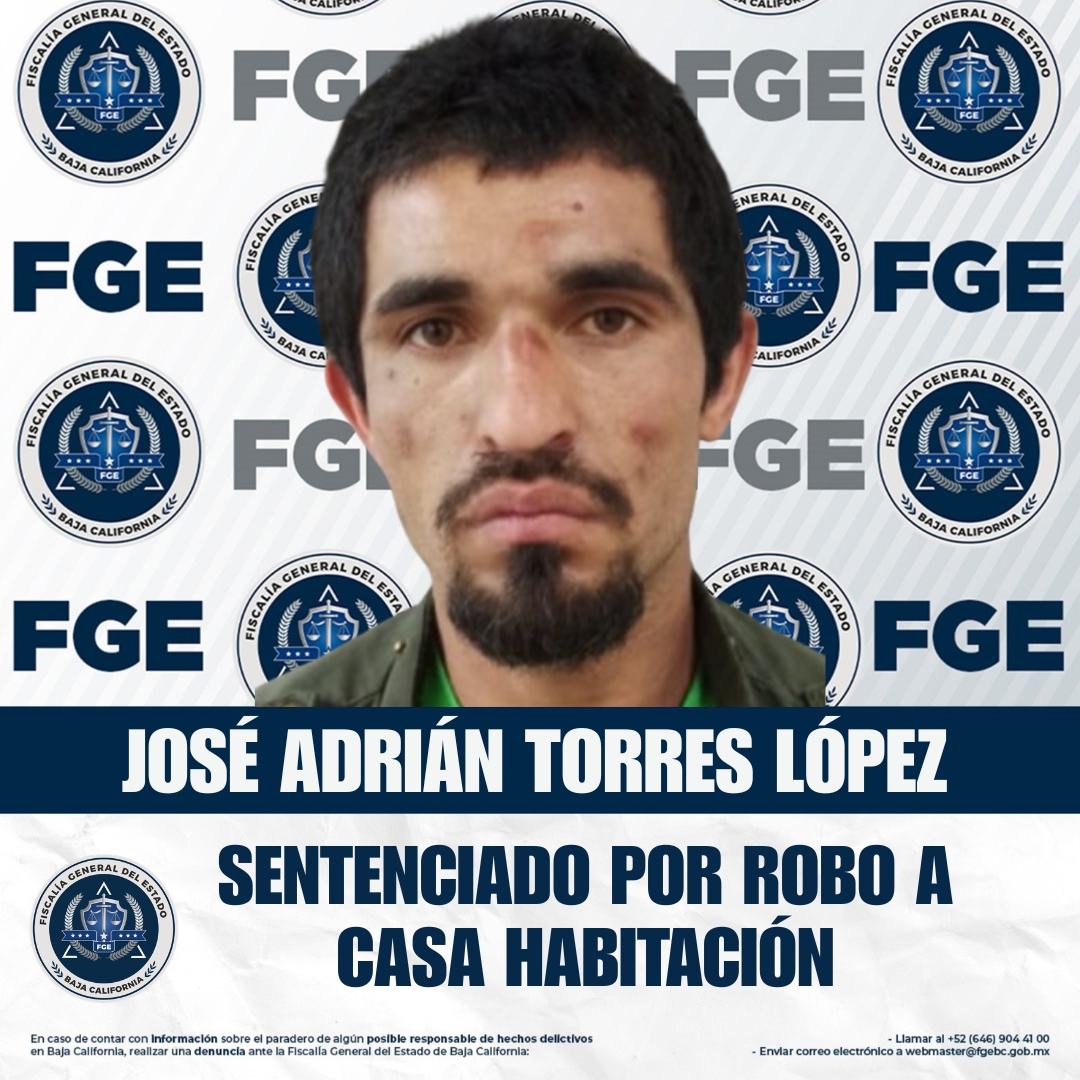 ENSENADA, BAJA CALIFORNIA. - La Fiscalía General del Estado, a través de la Fiscalía Regional de Ensenada y la Unidad de Investigación de Robos, obtuvo sentencia condenatoria en contra de José Adrián Torres López por el delito de robo calificado a casa habitación, como resultado de la integración de la carpeta de investigación y la presentación de pruebas ante la autoridad judicial.