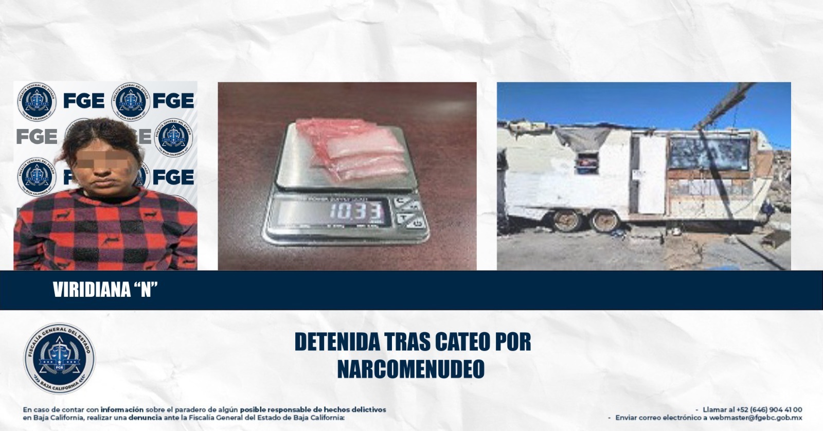 Durante el operativo se logró la detención de Viridiana “N”, así como el decomiso de diversos narcóticos, entre los que destacan seis envoltorios de plástico color rosa con sello de grapa metálica, los cuales contenían en su interior una sustancia color blanco con las características de la droga conocida como metanfetamina, además del aseguramiento del domicilio en cuestión.