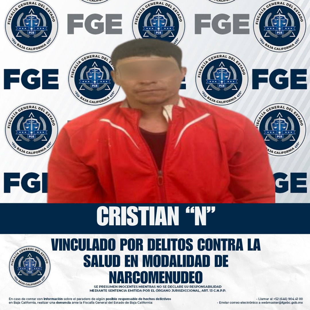 SAN QUINTÍN, BAJA CALIFORNIA. - La Fiscalía General del Estado, a través de la Fiscalía Especializada en Narcomenudeo, obtuvo la vinculación a proceso de Cristian “N” por su probable responsabilidad en delitos contra la salud, en las modalidades de posesión simple del psicotrópico metanfetamina y posesión simple del estupefaciente marihuana.