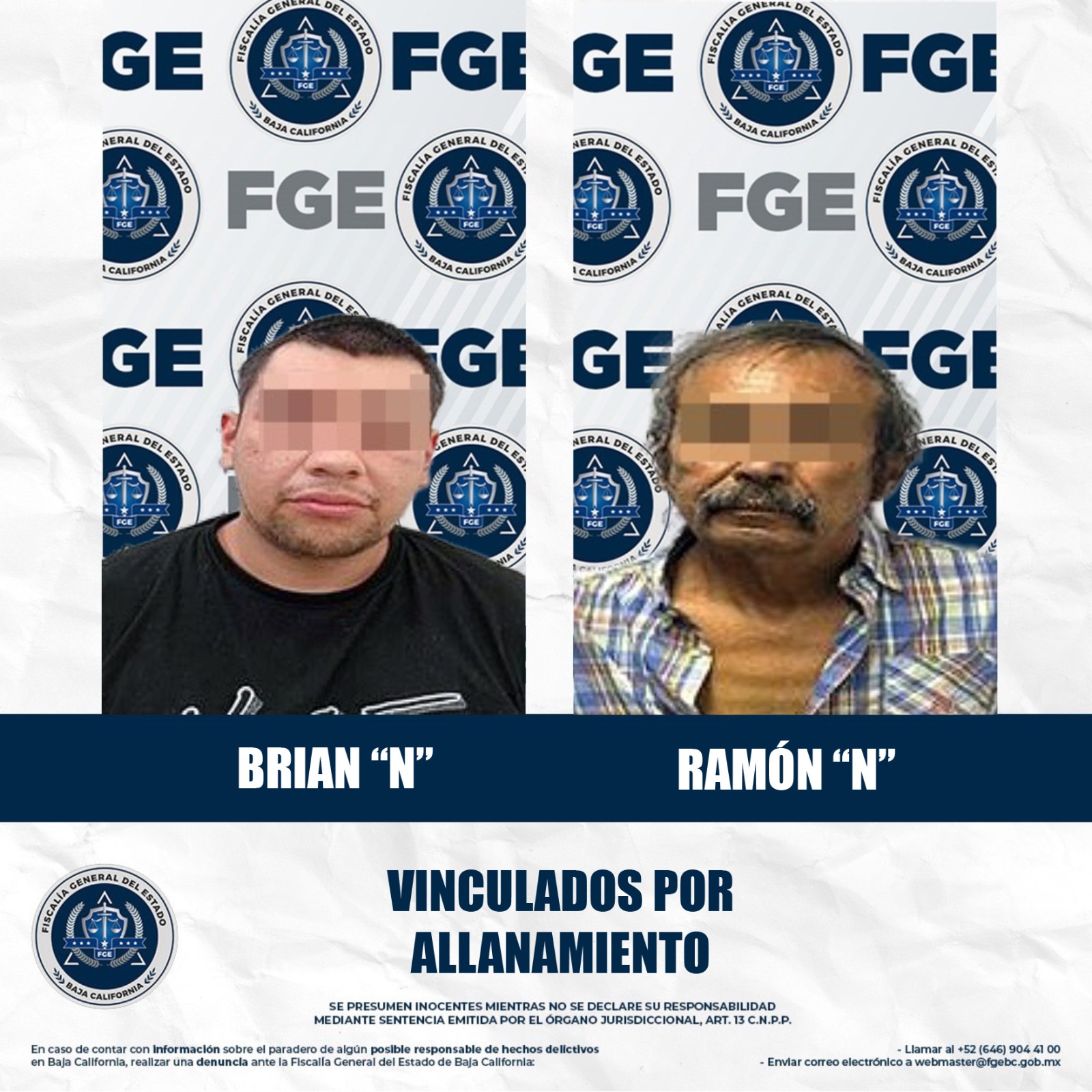 MEXICALI, BAJA CALIFORNIA. - Con base en las pruebas presentadas, la Fiscalía Regional de Mexicali obtuvo la vinculación a proceso de dos sujetos acusados del delito de allanamiento, en eventos ocurridos recientemente en la zona urbana y el valle de la ciudad.