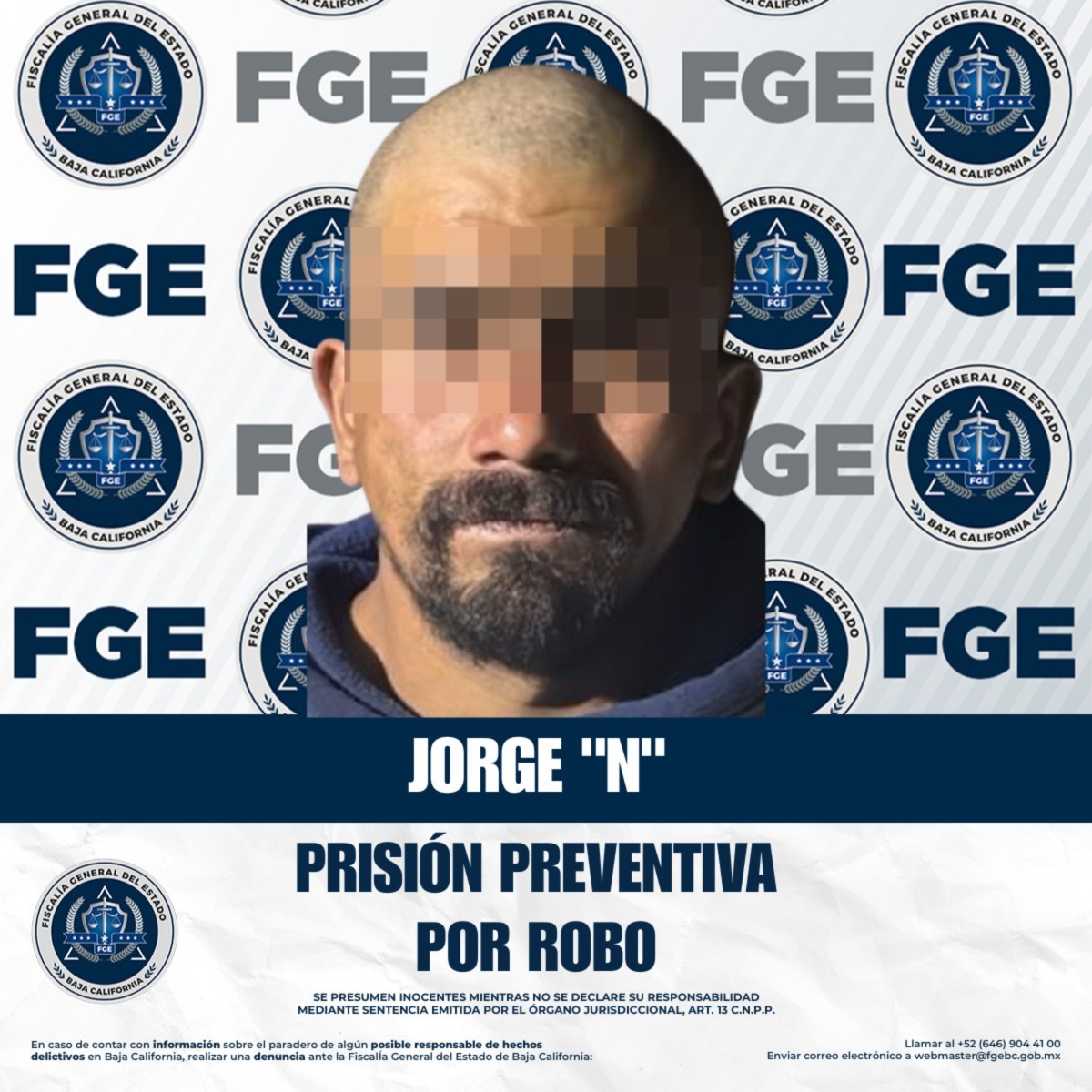 TIJUANA, BAJA CALIFORNIA. - La Fiscalía Regional de Tijuana obtuvo la medida cautelar de prisión preventiva justificada en contra de Jorge “N”, por su probable responsabilidad en el delito de robo. Lo anterior, derivado de la labor de investigación y seguimiento realizada por el Ministerio Público, quien presentó ante la autoridad judicial los elementos necesarios para la revocación de beneficios previamente otorgados al imputado.