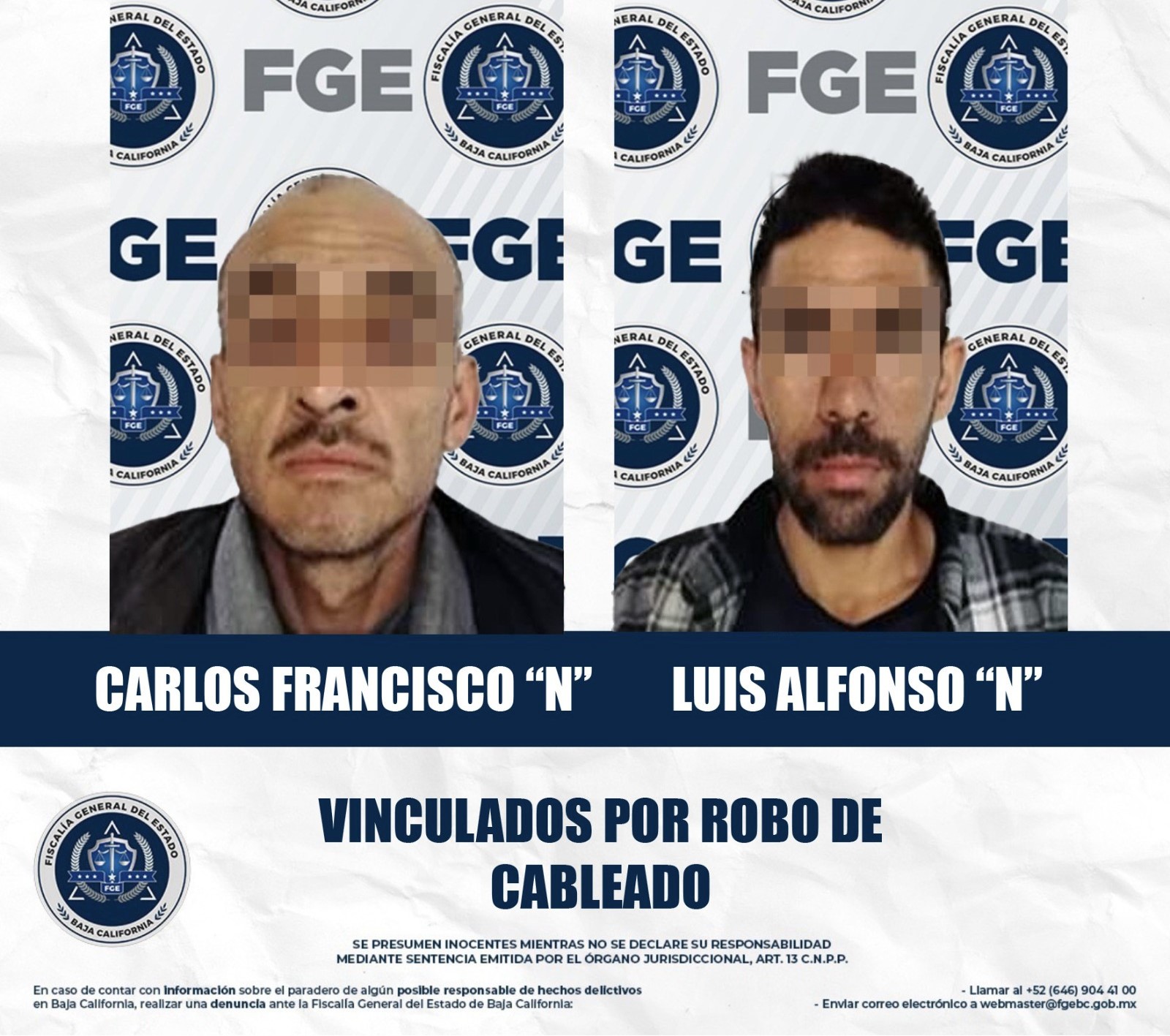 MEXICALI, BAJA CALIFORNIA. - La Fiscalía Regional de Mexicali informa que, como resultado de las pruebas presentadas y la sólida integración de la carpeta de investigación, se obtuvo el auto de vinculación a proceso en contra de Carlos Francisco “N” y Luis Alfonso “N”, por su presunta responsabilidad en el delito de robo a cableado.