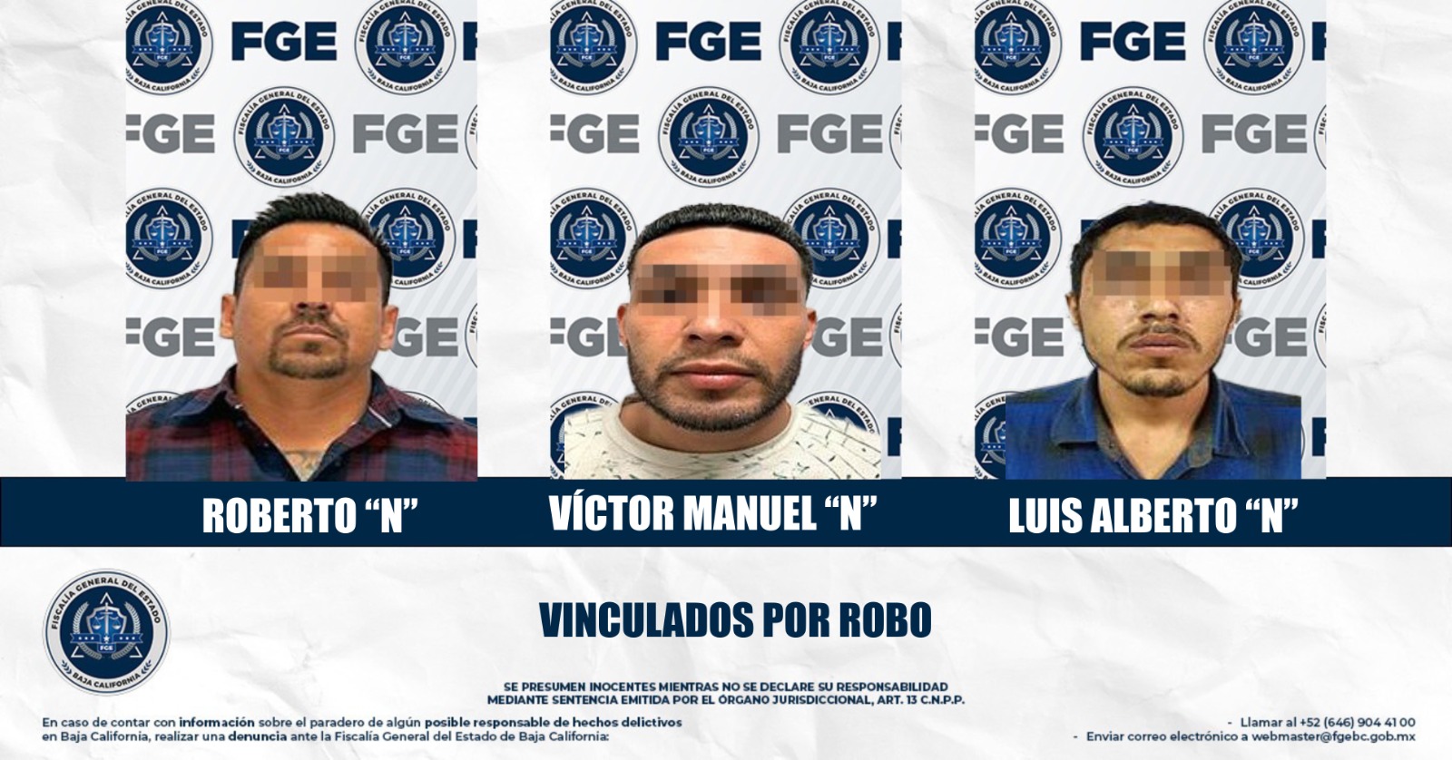 MEXICALI, BAJA CALIFORNIA. - La Fiscalía Regional de Mexicali, a través de la Unidad de Investigación de Delitos de Robo Poniente, logró la vinculación a proceso de tres sujetos presuntamente relacionados en diversos robos ejecutados con violencia.