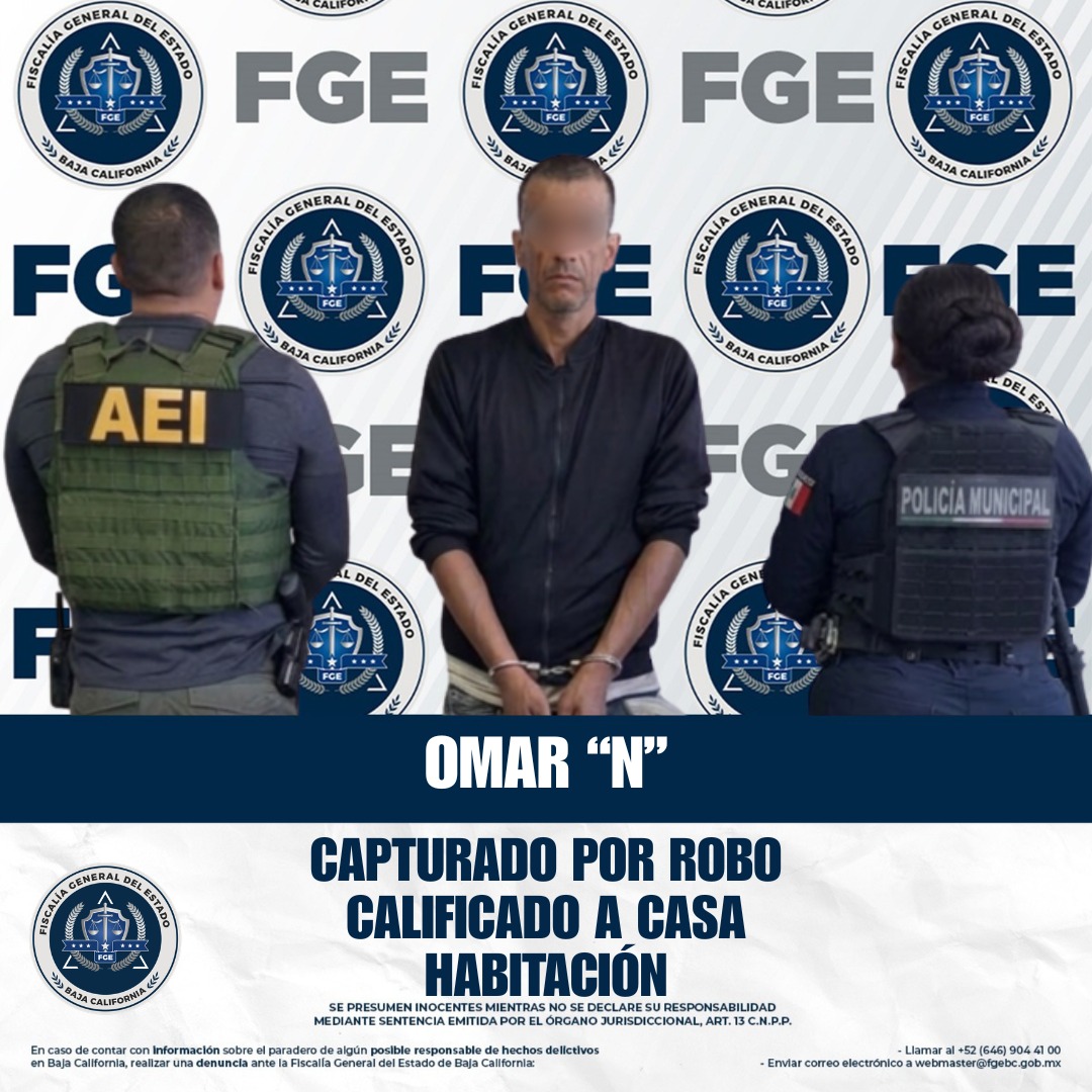 ENSENADA, BAJA CALIFORNIA. - Elementos de la Fiscalía General del Estado, adscritos al Grupo de Aprehensiones de la Agencia Estatal de Investigación en Ensenada, cumplimentaron una orden de aprehensión contra Omar “N”, por su probable responsabilidad en el delito de robo calificado a casa habitación.