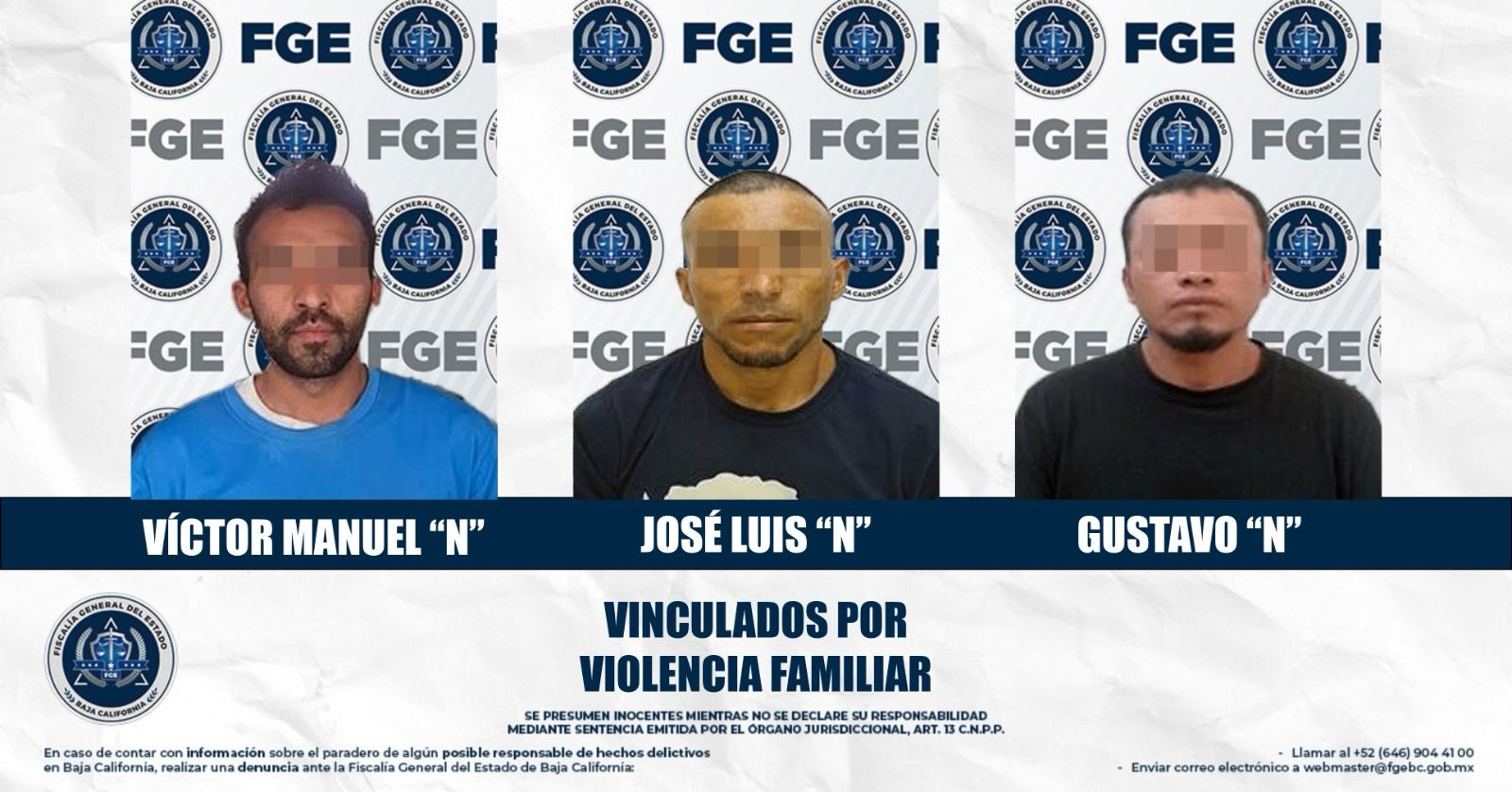 MEXICALI, BAJA CALIFORNIA. - La Fiscalía Regional de Mexicali, obtuvo la vinculación a proceso de tres individuos presuntamente responsables de agresiones físicas y verbales en contra de sus familiares y parejas sentimentales en incidentes recientes.