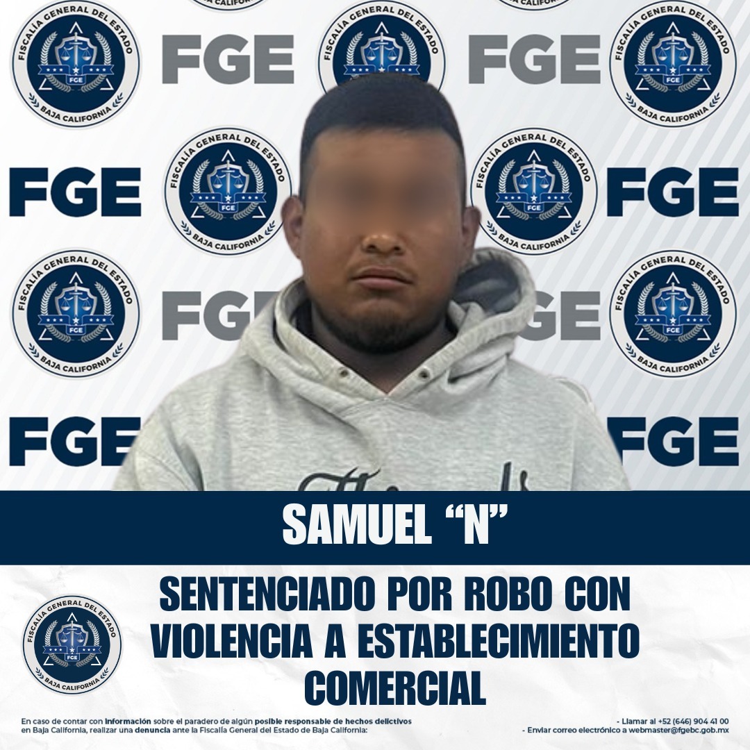 SAN QUINTÍN, BAJA CALIFORNIA. - La Fiscalía Regional de San Quintín, a través de la Unidad de Investigación, obtuvo sentencia condenatoria de 7 años y 4 meses de prisión en contra de Samuel “N”, por el delito de robo calificado cometido a establecimiento comercial abierto al público, ejecutado con violencia.