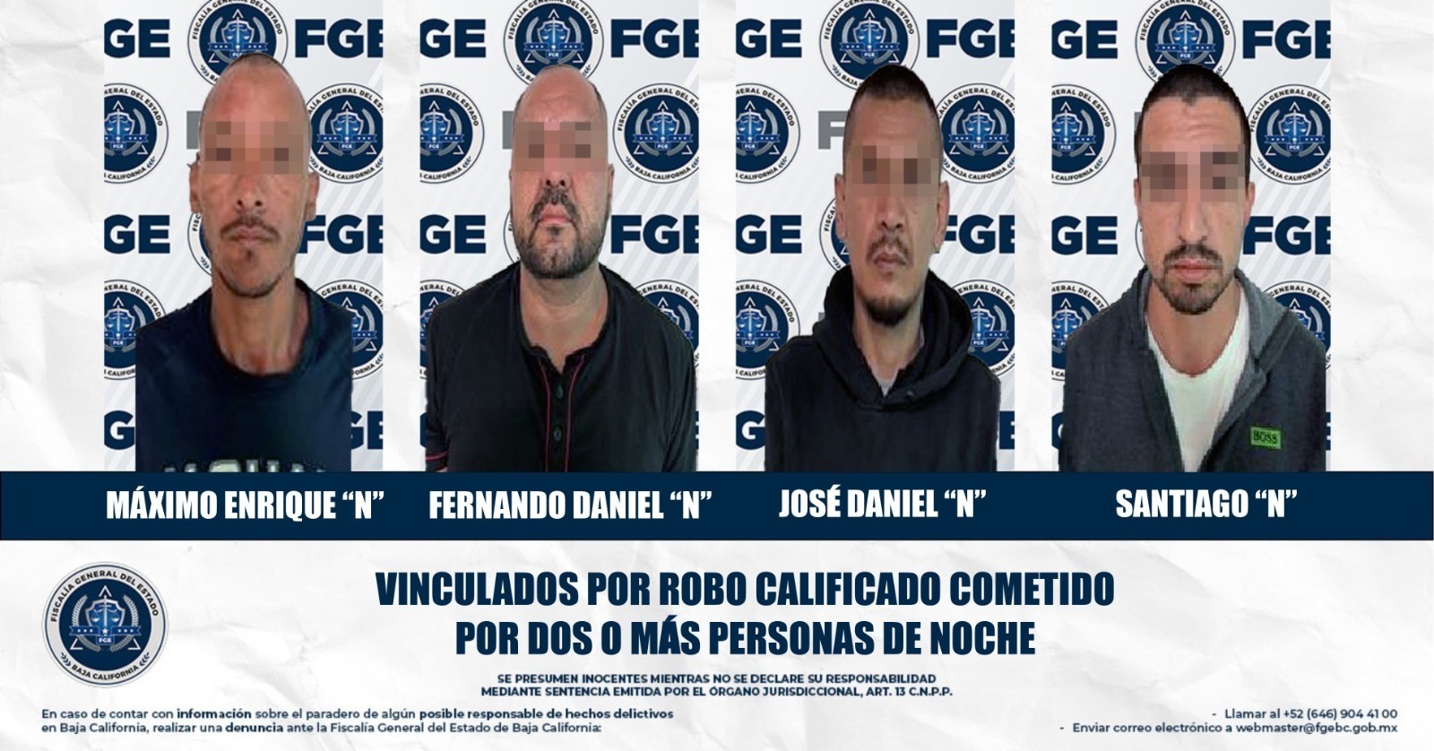 MEXICALI, BAJA CALIFORNIA. - La Fiscalía Regional de Mexicali, a través de la Unidad de Investigación de Delitos de Robo Oriente, obtuvo la vinculación a proceso de Máximo Enrique “N”, Fernando Daniel “N”, José Daniel “N” y Santiago “N”, esto por su presunta participación en el delito de robo calificado cometido por dos o más personas de noche.