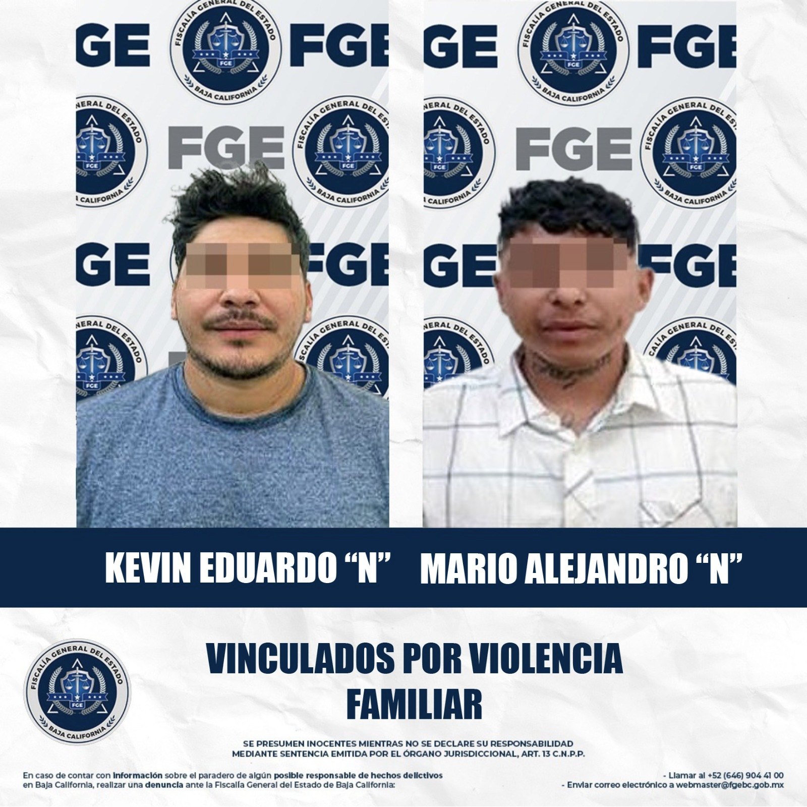 MEXICALI, BAJA CALIFORNIA - La Fiscalía General del Estado a través de la Unidad de Investigación de Delitos con Detenidos Poniente de la Fiscalía Regional de Mexicali, obtuvo la vinculación a proceso de Kevin Eduardo “N” y Mario Alejandro “N”, señalados por agresiones físicas y verbales en incidentes distintos.