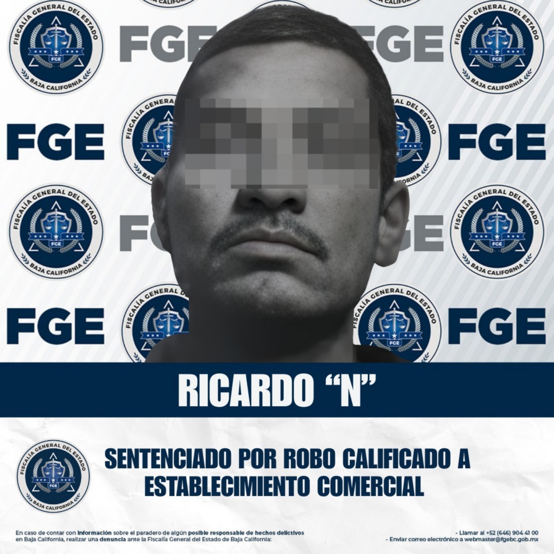 ENSENADA, BAJA CALIFORNIA. - La Fiscalía General del Estado, a través de la Fiscalía Regional de Ensenada y de la Unidad de Investigación de Robos, obtuvo sentencia condenatoria en contra de Ricardo “N” por su responsabilidad en el delito de robo calificado a establecimiento comercial abierto al público.