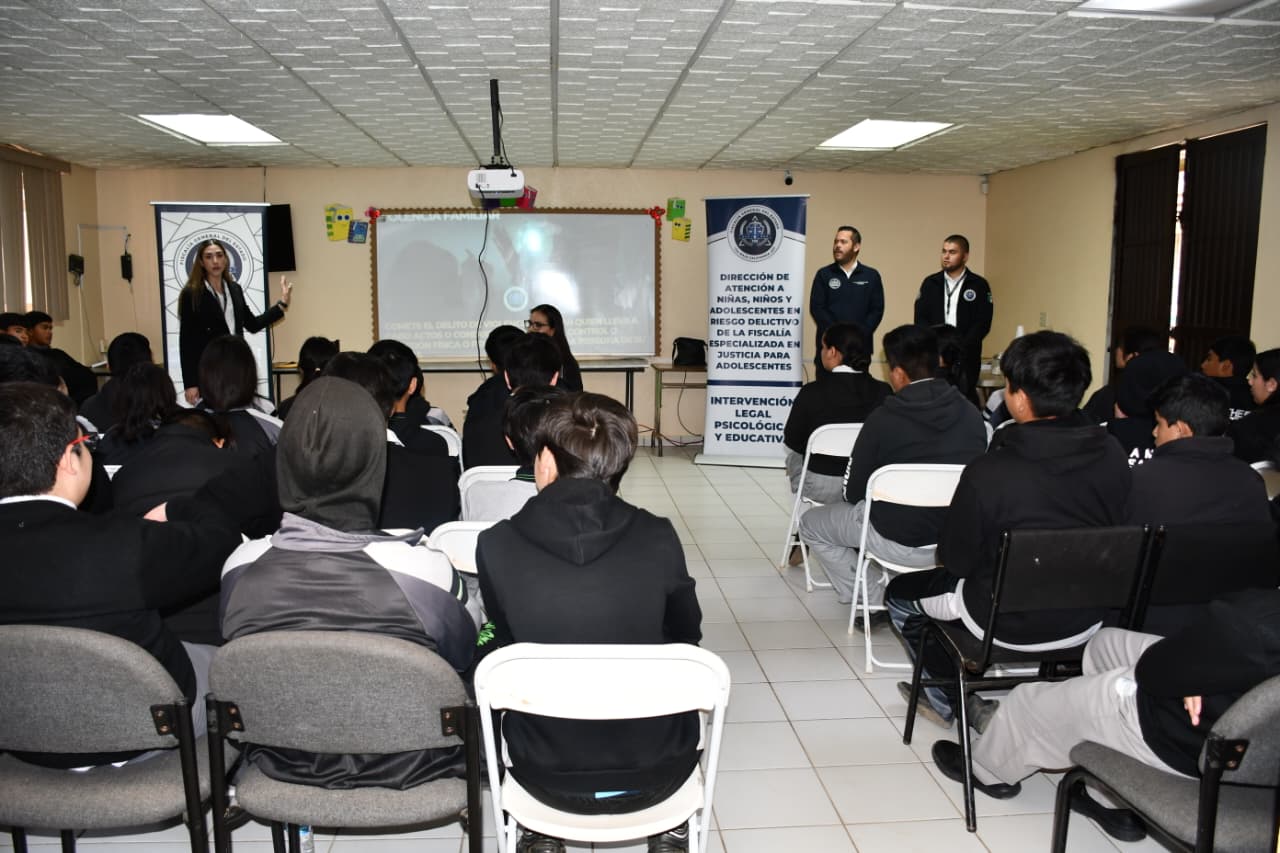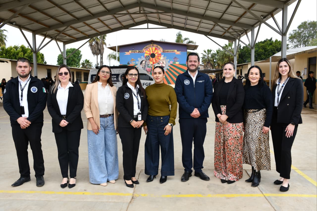 SAN QUINTÍN, BAJA CALIFORNIA. - La Fiscalía General del Estado (FGE) llevó a cabo un acercamiento con alrededor de 400 alumnas y alumnos de la Secundaria No. 85 “Pioneros del Valle”, en San Quintín, como parte de las acciones preventivas que impulsa para fortalecer entornos seguros y promover la sana convivencia entre la juventud.