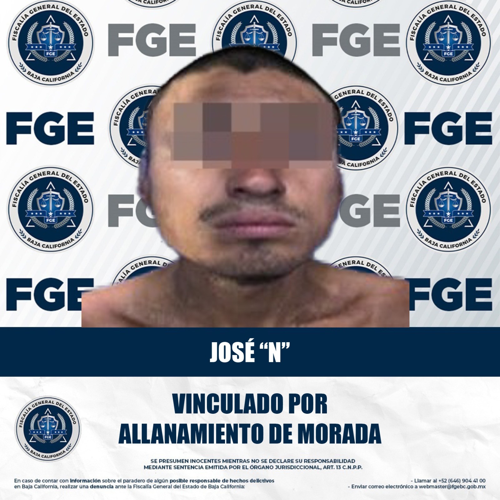 MEXICALI, BAJA CALIFORNIA - La Fiscalía Regional de Mexicali, a través de la Unidad de Investigación de Delitos con Detenidos Oriente, obtuvo la vinculación a proceso de José “N”, esto por su presunta participación en el delito de allanamiento de morada.