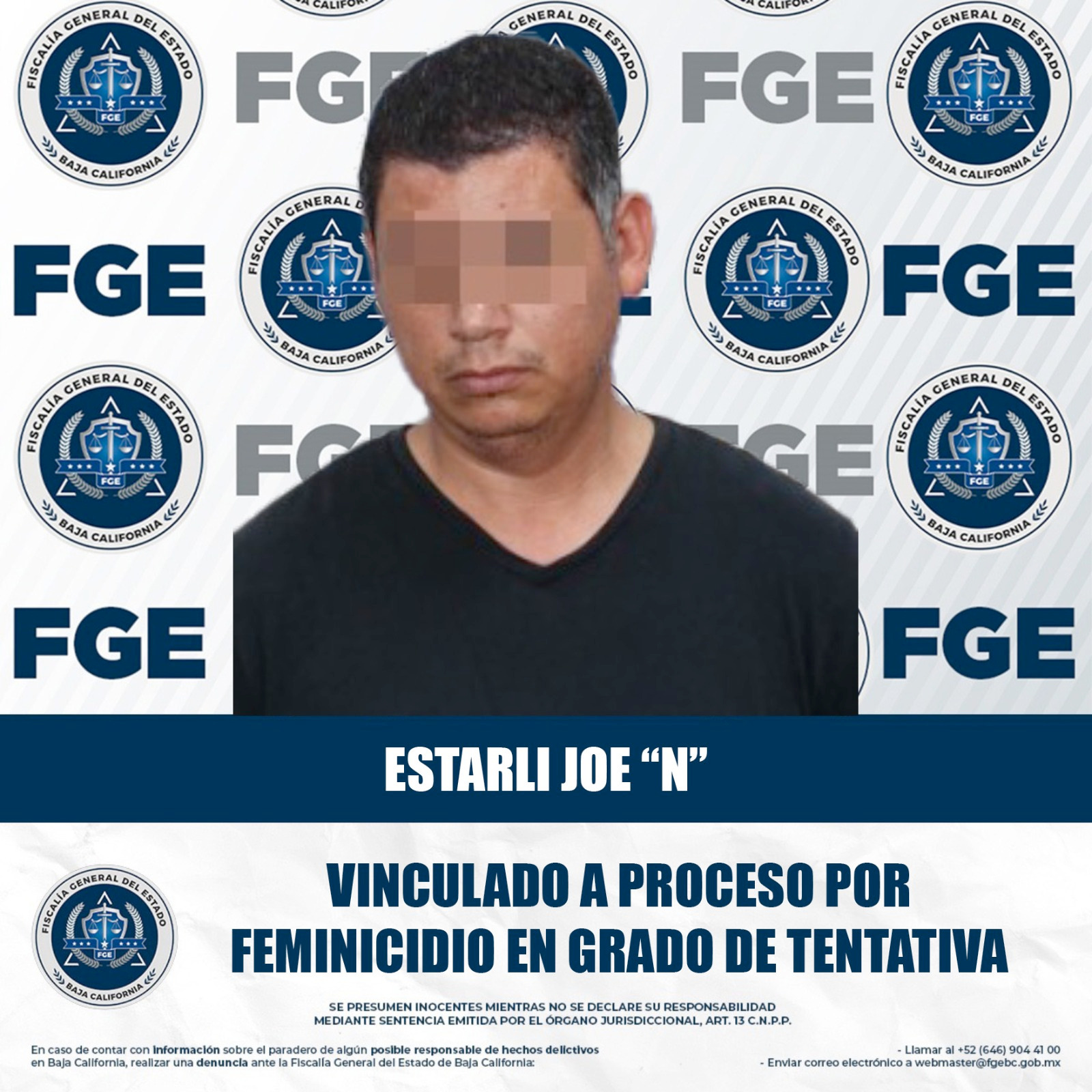 MEXICALI, BAJA CALIFORNIA. - La Fiscalía General del Estado, a través de la Fiscalía Especializada en Delitos contra Mujeres por razón de Género, obtuvo el auto de vinculación a proceso en contra de Estarli Joe “N”, por su probable responsabilidad en el delito de feminicidio en grado de tentativa.