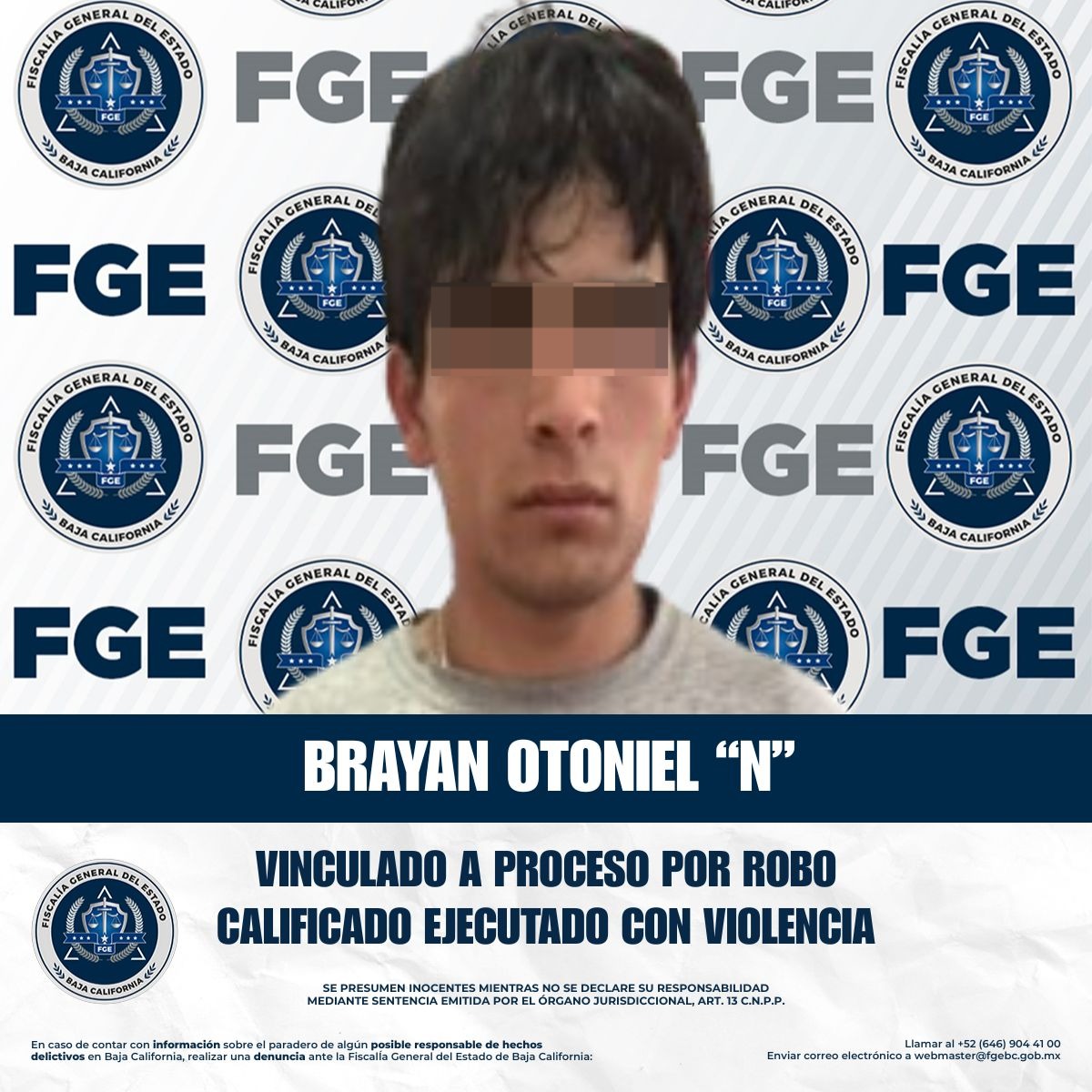 TIJUANA, BAJA CALIFORNIA. - La Unidad de Investigación con Detenido, adscrita a la Fiscalía Regional de Tijuana, obtuvo la vinculación a proceso y la medida cautelar de prisión preventiva justificada en contra de Brayan Otoniel “N”, por su presunta responsabilidad en el delito de robo calificado cometido por dos o más personas armadas y ejecutado con violencia.