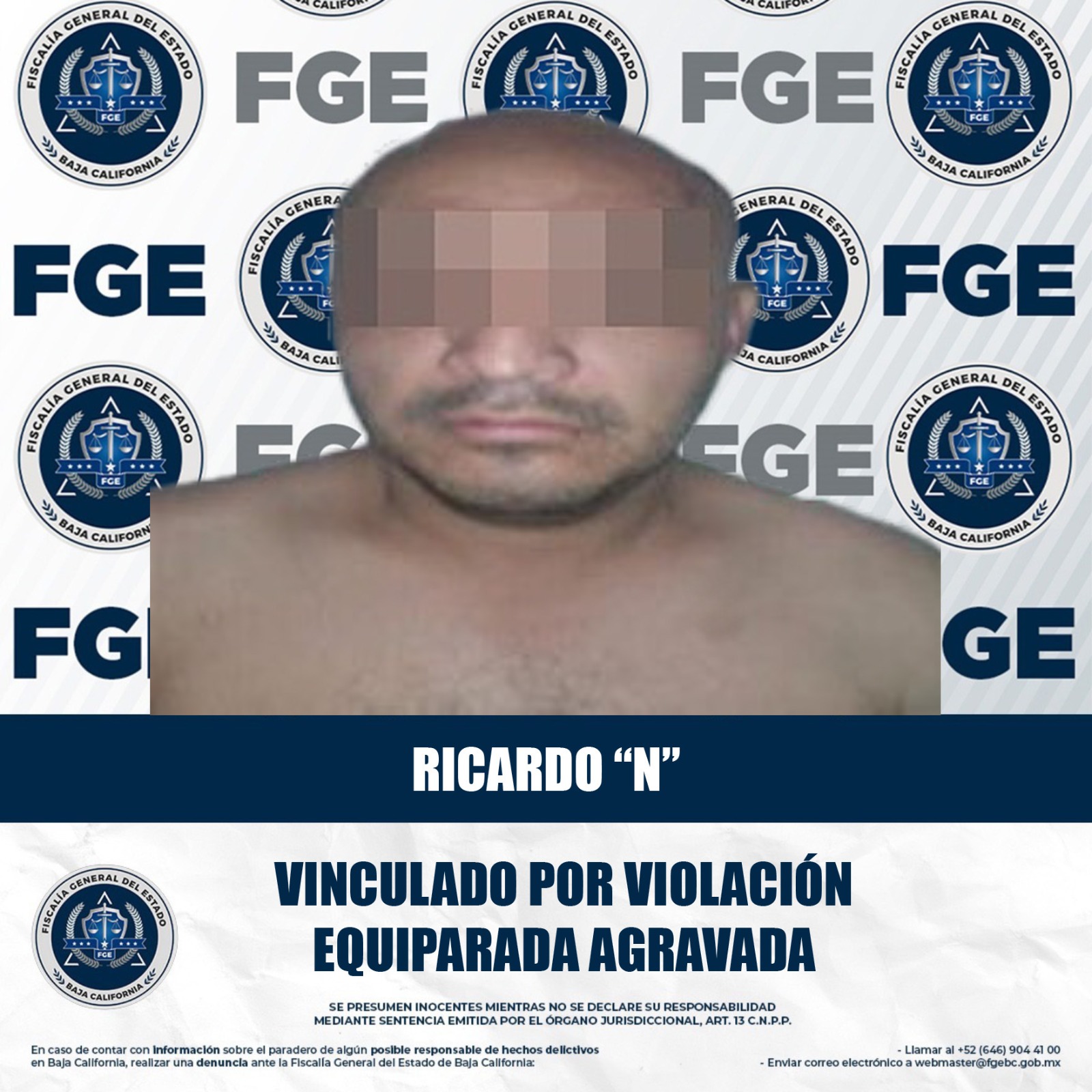 MEXICALI, BAJA CALIFORNIA. - La Fiscalía Regional de Mexicali, a través de la Unidad de Investigación con Detenidos Oriente, logró la vinculación a proceso de Ricardo “N”, señalado por su presunta responsabilidad en el delito de violación equiparada agravada.