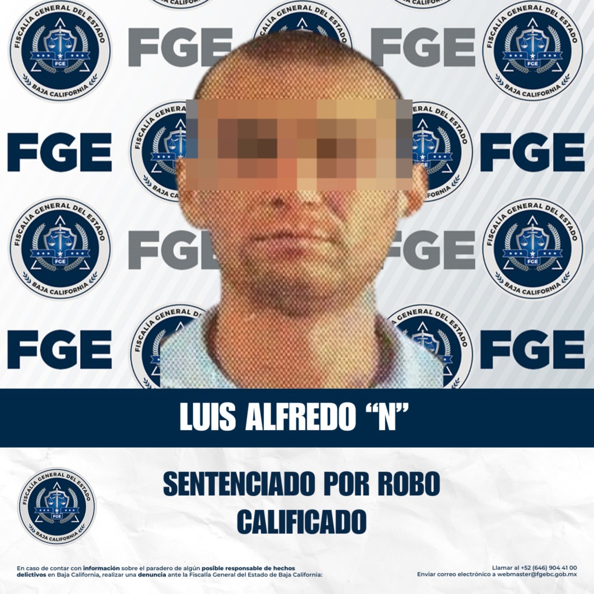 TIJUANA, BAJA CALIFORNIA. - La Fiscalía Regional de Tijuana, a través de la Unidad de Investigación de Robos La Mesa, informa que logró obtener sentencia condenatoria en contra de Luis Alfredo “N”, por su responsabilidad en el delito de robo calificado. Lo anterior es resultado del trabajo de investigación y la integración de datos de prueba presentados por el Ministerio Público, los cuales permitieron acreditar la participación del acusado en el hecho delictivo.