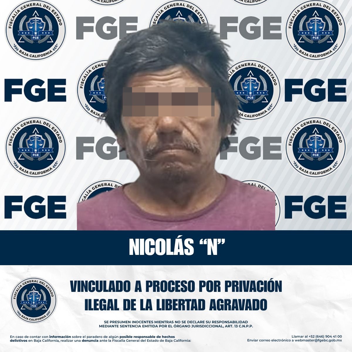 TIJUANA, BAJA CALIFORNIA. - La Unidad de Investigación con Detenido, adscrita a la Fiscalía Regional de Tijuana, obtuvo la vinculación a proceso y la imposición de la medida cautelar de prisión preventiva en contra de Nicolás “N”, por su presunta responsabilidad en el delito de privación ilegal de la libertad agravada.