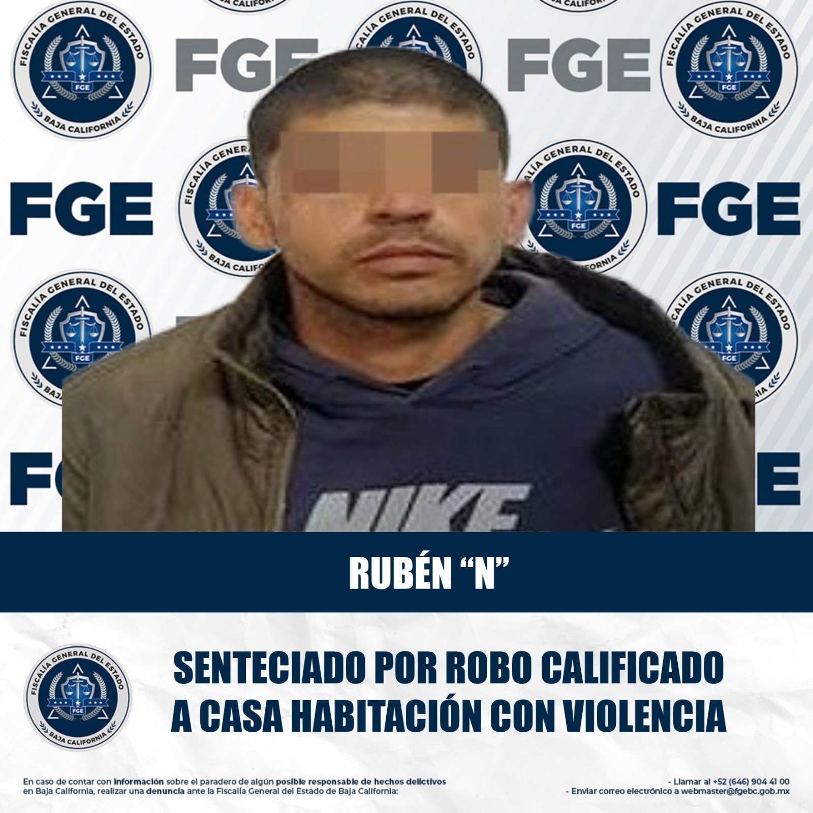 MEXICALI, BAJA CALIFORNIA. - La Fiscalía General del Estado, a través de la Unidad de Investigación de Delitos de Robo Poniente, logró una sentencia condenatoria en contra de Rubén “N” por el delito de robo calificado a casa habitación con violencia.