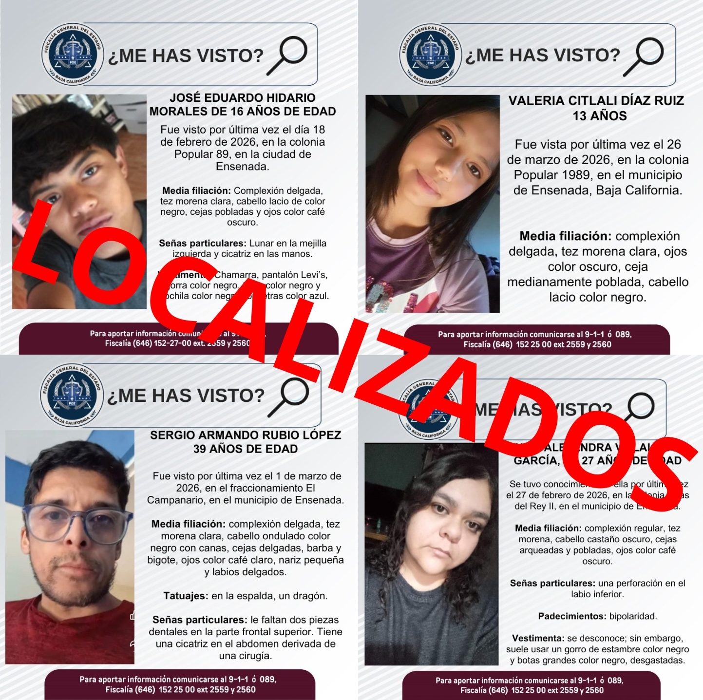 ENSENADA, BAJA CALIFORNIA. - La Fiscalía General del Estado, a través de la Unidad Especializada para la Investigación y Persecución de Delitos de Desaparición Forzada y Desaparición Cometida por Particulares, informó la localización de cuatro personas que habían sido reportadas como no localizadas en Ensenada.