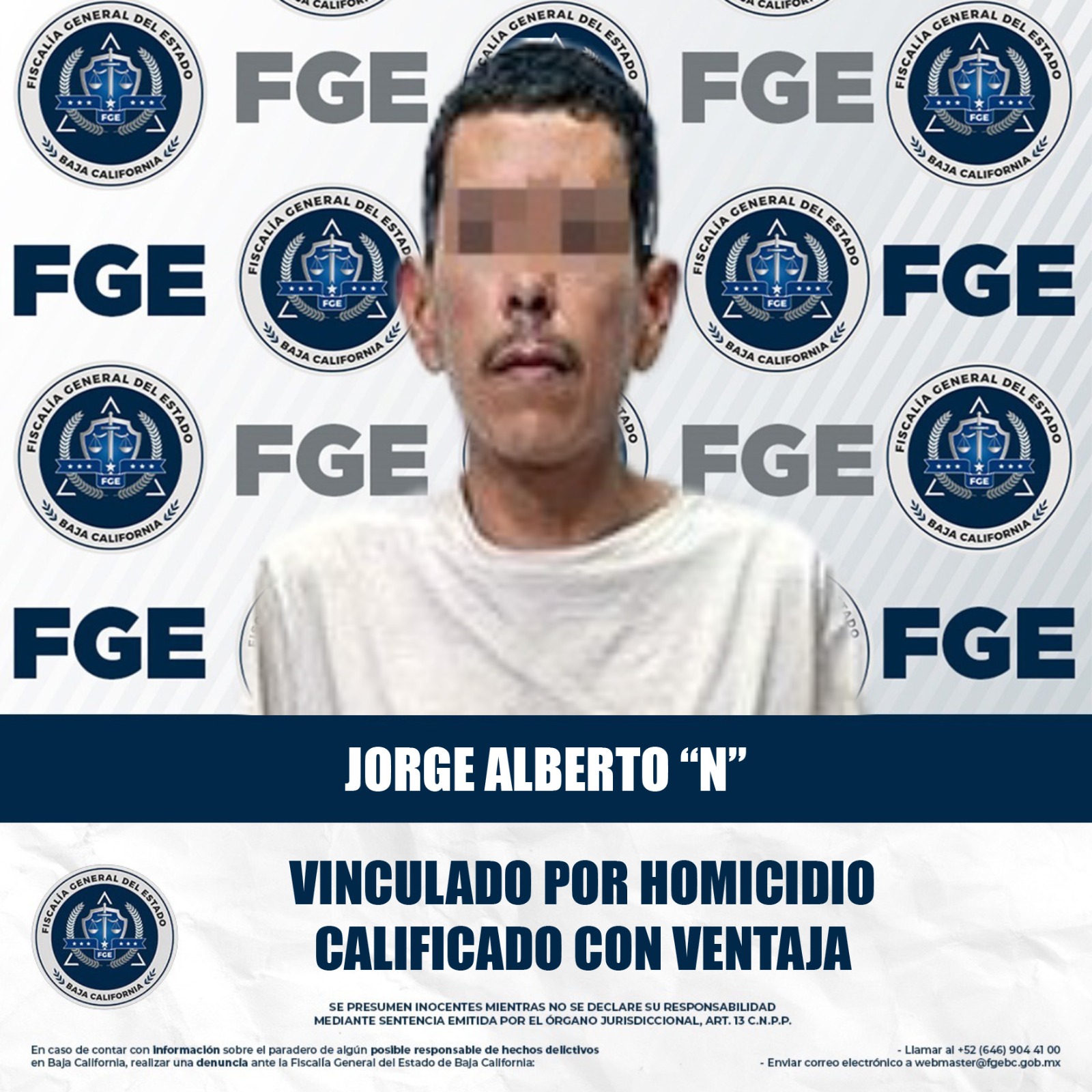 MEXICALI, BAJA CALIFORNIA. - La Fiscalía General del Estado (FGE), a través de la Fiscalía Especializada en Delitos Contra la Vida, obtuvo la vinculación a proceso de Jorge Alberto “N”, señalado por su presunta responsabilidad en el delito de homicidio calificado con ventaja.