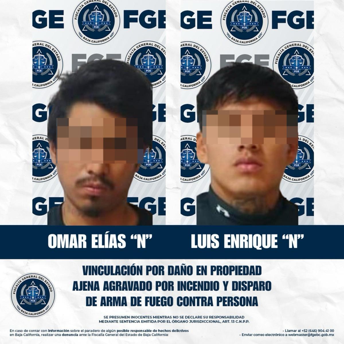 TECATE, BAJA CALIFORNIA. - La Fiscalía Regional de Tecate, a través de la Unidad de Investigación de Delitos con Detenido, informa que fueron vinculados a proceso los imputados Omar Elías “N” y Luis Enrique “N”, por su presunta responsabilidad en los delitos de daño en propiedad ajena agravado por incendio y disparo de arma de fuego contra persona.