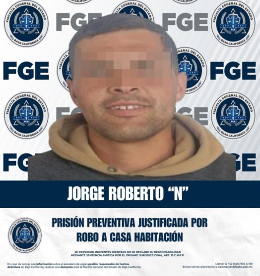 TECATE, BAJA CALIFORNIA. - La Fiscalía Regional de Tecate, a través de la Unidad de Delitos Contra Robos, informa que se reaperturó el proceso penal en contra de Jorge Roberto “N”, alias “El Güero”, por su probable responsabilidad en el delito de robo calificado en casa habitación. Como resultado de las diligencias judiciales, se impuso la medida cautelar de prisión preventiva justificada.