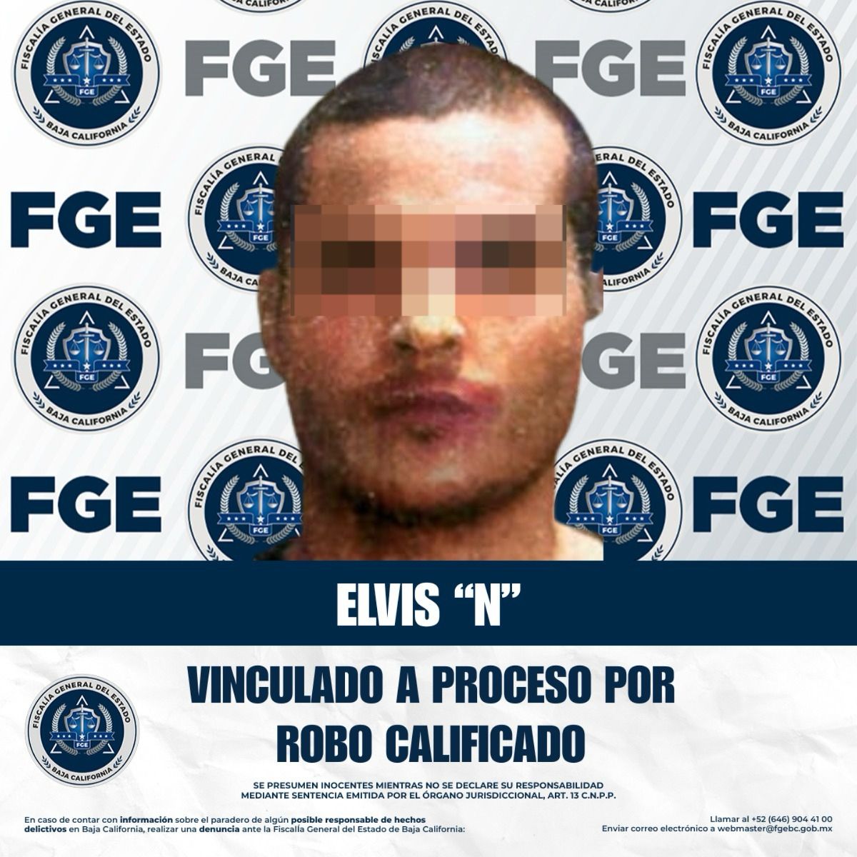 TIJUANA, BAJA CALIFORNIA. - La Fiscalía Regional de Tijuana informa que, como resultado del seguimiento a las investigaciones realizadas por el Ministerio Público, se obtuvo la modificación de la medida cautelar a prisión preventiva justificada en contra de Elvis “N”, imputado por el delito de robo calificado cometido por dos o más personas.