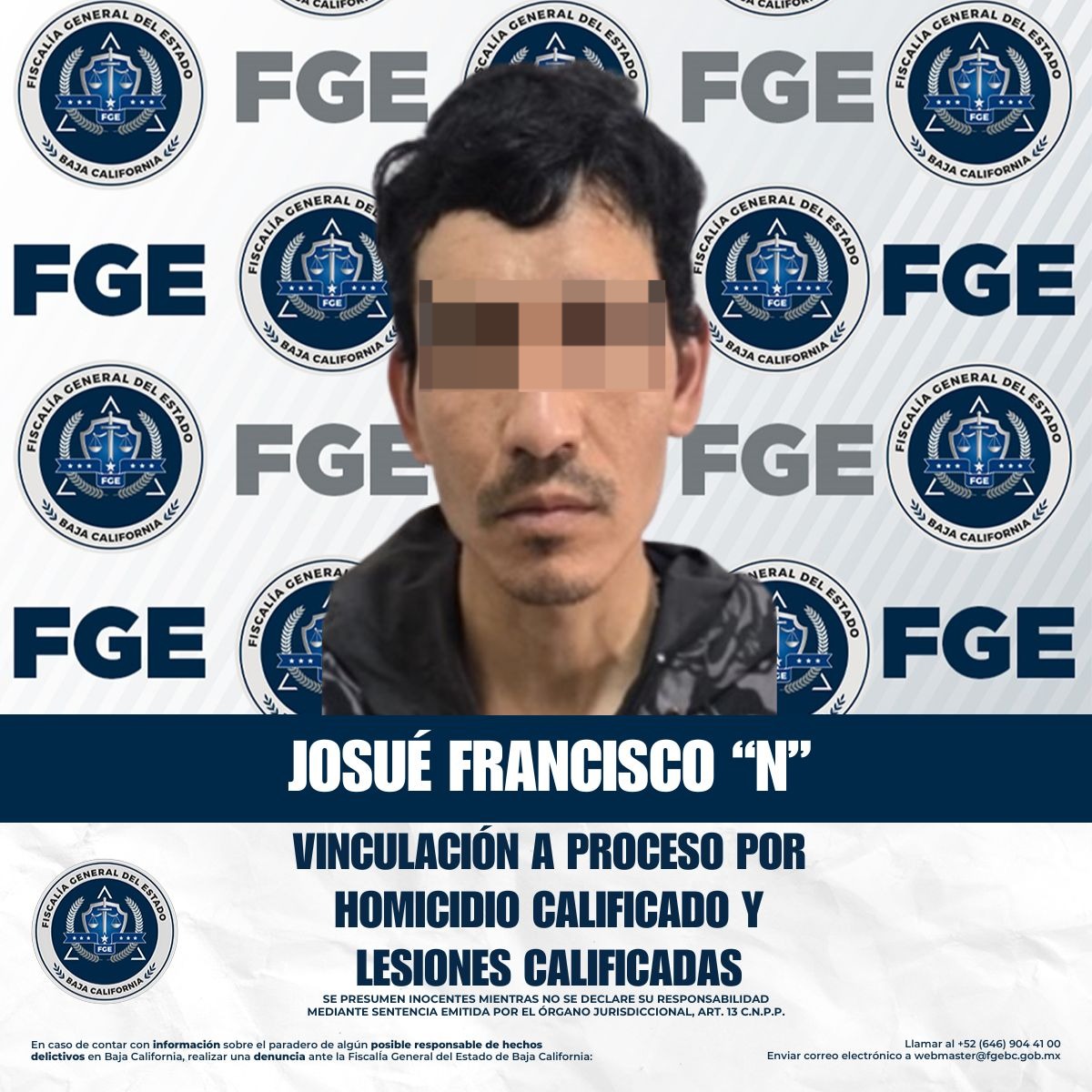 TIJUANA, BAJA CALIFORNIA. - La Fiscalía Especializada en Delitos Contra la Vida obtuvo la vinculación a proceso y la medida cautelar de prisión preventiva oficiosa en contra de Josué Francisco “N”, por su presunta responsabilidad en los delitos de homicidio calificado y lesiones calificadas.