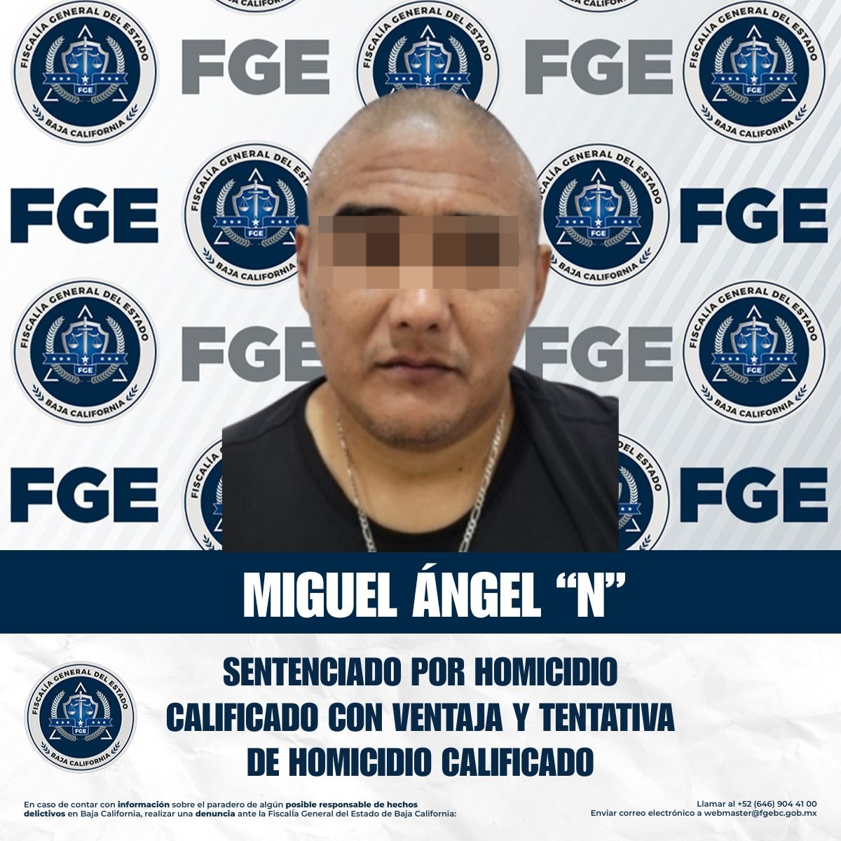 TIJUANA, BAJA CALIFORNIA. - La Fiscalía Especializada en Delitos Contra la Vida obtuvo sentencia condenatoria de 33 años y 4 meses de prisión, mediante procedimiento abreviado, en contra de Miguel Ángel “N”, por los delitos de homicidio calificado con ventaja y homicidio calificado en grado de tentativa.