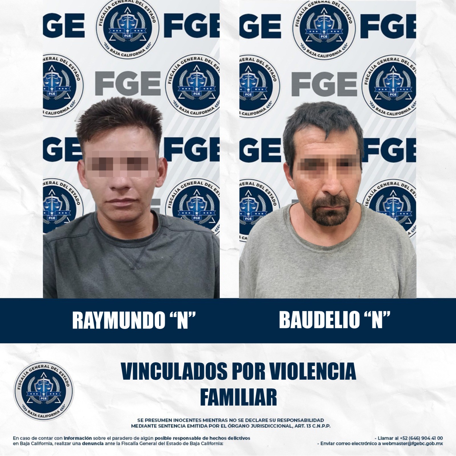 MEXICALI, BAJA CALIFORNIA. - La Fiscalía Regional de Mexicali a través de la Unidad de Investigación de Delitos con Detenido Poniente logró la vinculación a proceso de dos hombres relacionados en incidentes de violencia familiar ocurridos recientemente en la capital del estado.