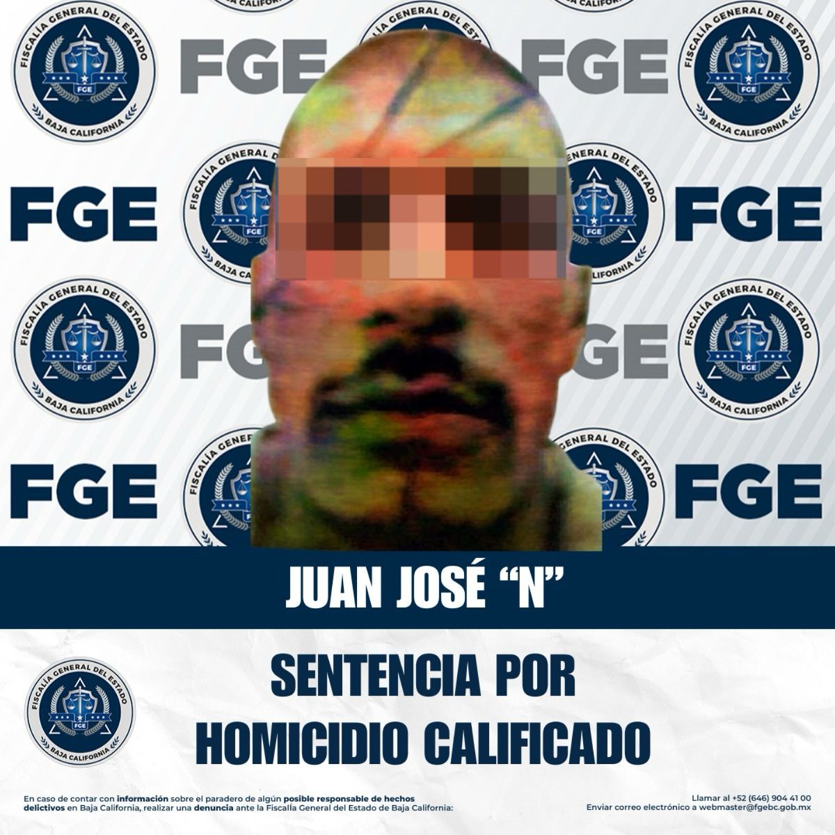 TIJUANA, BAJA CALIFORNIA. - La Fiscalía General del Estado, a través de la Fiscalía Regional de Tijuana y la Coordinación de Averiguaciones Previas y Control de Procesos, informa que se obtuvo una sentencia condenatoria de 20 años de prisión en contra de Juan José “N”, alias “El Jonny”, por su responsabilidad en el delito de homicidio calificado.