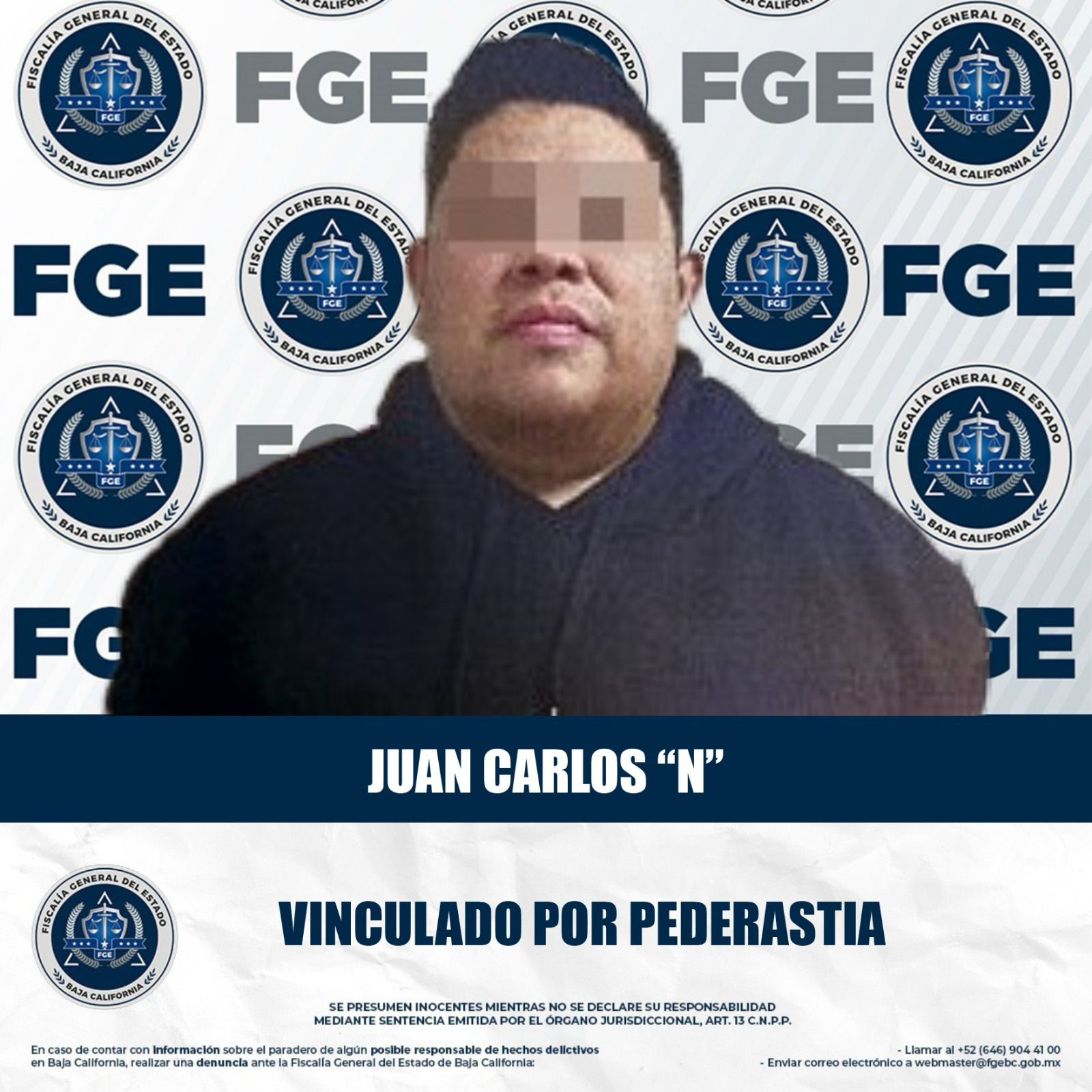 MEXICALI, BAJA CALIFORNIA. - La Fiscalía General del Estado, a través de la Fiscalía Especializada en Delitos Relacionados con la Violencia de Género contra las Mujeres, obtuvo de un Juez de Control la vinculación a proceso en contra de Juan Carlos “N”, por su probable responsabilidad en el delito de pederastia.