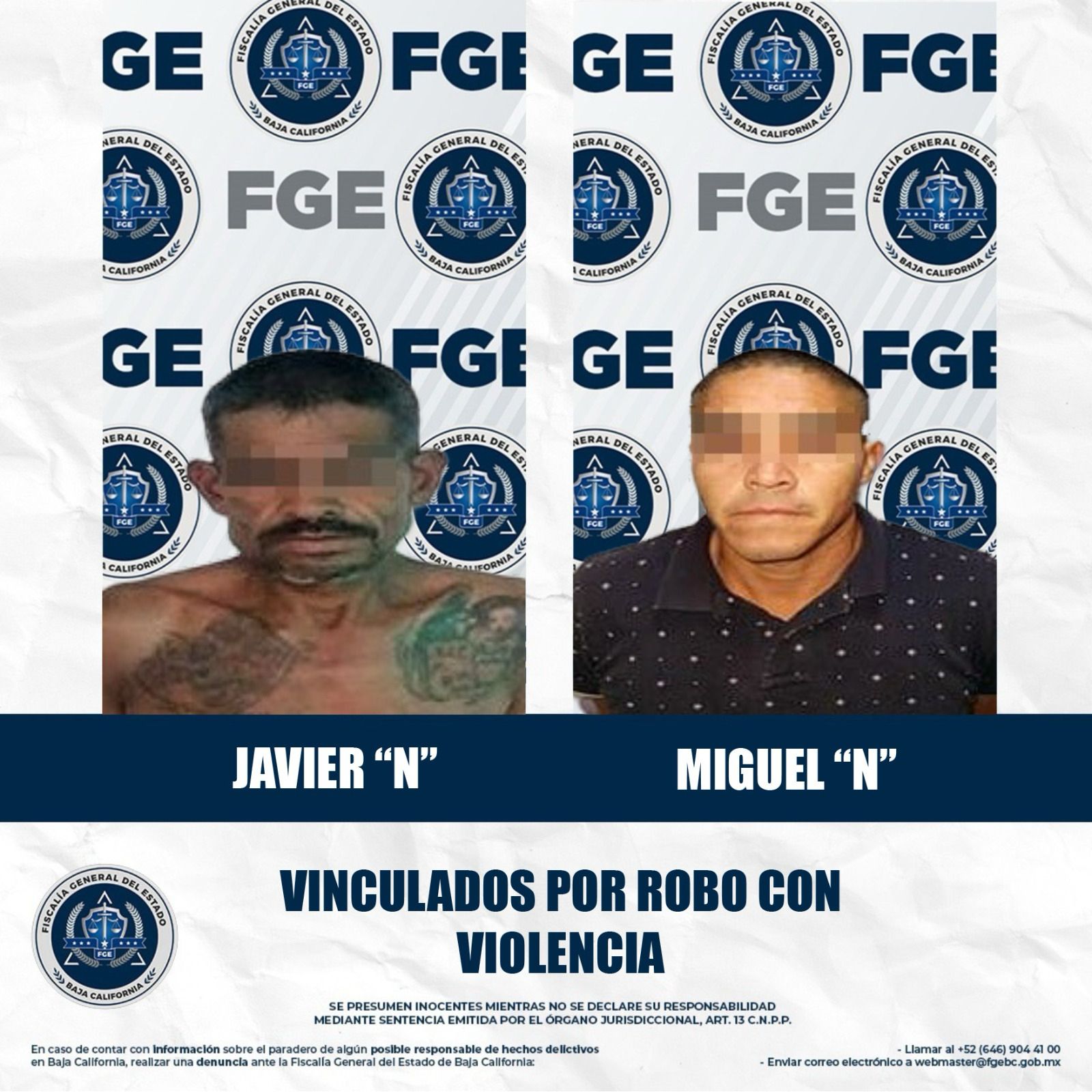 MEXICALI, BAJA CALIFORNIA. - La Fiscalía Regional de Mexicali, a través de la Unidad de Investigación con Detenidos Oriente y Robo Oriente, obtuvo la vinculación a proceso de dos hombres presuntamente relacionados en robos con violencia.