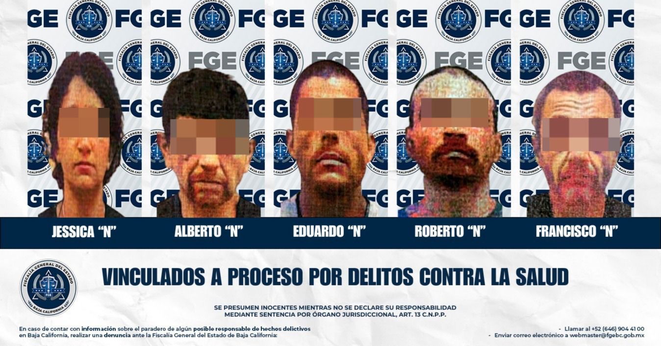 TIJUANA, BAJA CALIFORNIA. - La Fiscalía General del Estado informa que cinco personas fueron vinculadas a proceso penal por delitos contra la salud, en su modalidad de narcomenudeo, luego de que el Ministerio Público presentó ante el Juez de Control los datos de prueba suficientes para que se determinara el inicio del proceso en su contra.