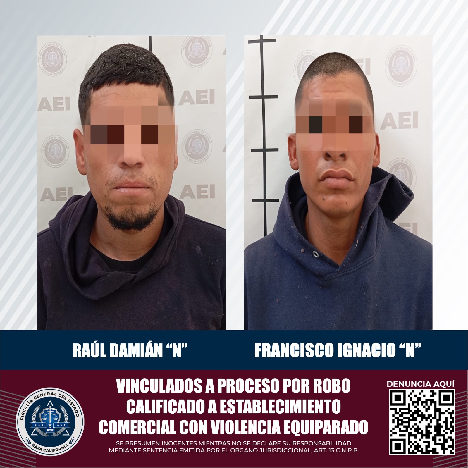 MEXICALI, B.C. La Fiscalía Regional de Mexicali obtuvo la vinculación a proceso de Francisco Ignacio “N” y Raúl Damián “N”, quienes presuntamente cometieron el delito de robo calificado a establecimiento comercial abierto al público con violencia equiparado.