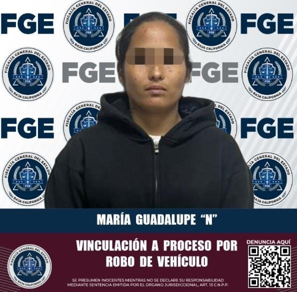 SAN QUINTÍN, B.C. La Fiscalía Regional de San Quintín obtuvo vinculación a proceso de María Guadalupe “N”, alias "La Cuata" por su presunta responsabilidad en la comisión del delito de robo de vehículo de motor con violencia, cometido hace unos meses en la delegación de Camalú.
