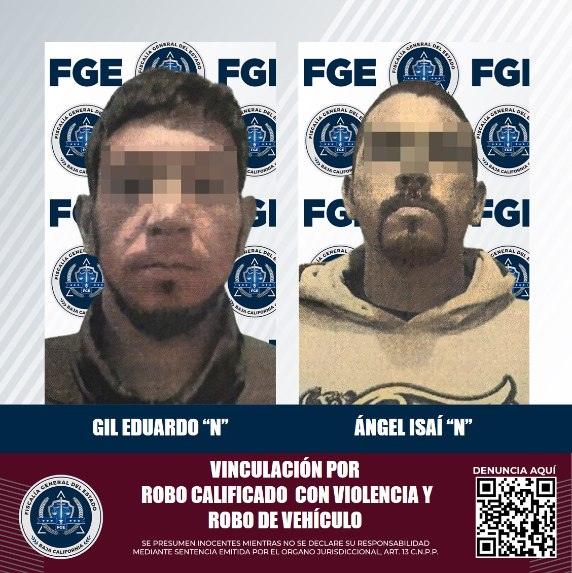 TIJUANA, B.C. Como resultado de acciones de investigación y pruebas recopiladas por la Fiscalía Regional de Tijuana, se logró la vinculación a proceso de dos hombres acusados de robo calificado a comercio abierto al público ejecutado con violencia y robo equiparado en su modalidad de uso de vehículo de motor robado.