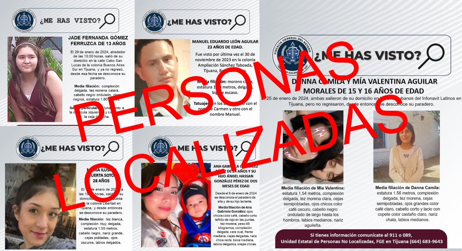 TIJUANA, B.C. El personal de la Fiscalía General del Estado ha logrado ubicar a siete personas que habían sido reportadas como desaparecidas, entre ellas se encuentran cuatro menores de edad.