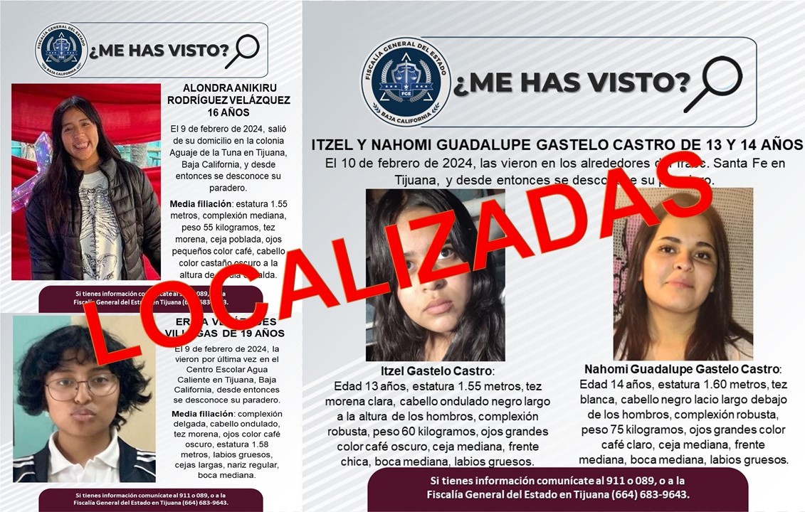 Las personas localizadas son: Erika Velázques Villegas de 19 años, Alondra Anikiru Rodríguez Velázquez de 16 años, e Itzel y Nahomi de apellidos Gastelo Castro de 13 y 14 años de edad, respectivamente.