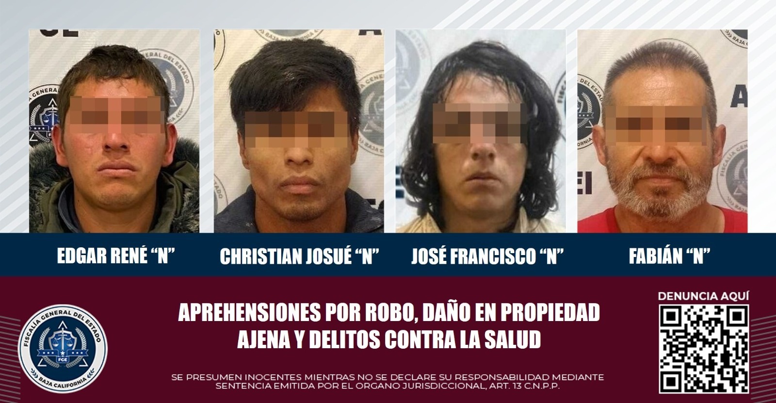 De acuerdo con la información proporcionada por la Unidad de Aprehensiones de la Fiscalía Estatal, la labor de gabinete y campo llevada a cabo por la Agencia Estatal de Investigación (AEI) permitió obtener información para localizar y capturar a los cuatro sujetos implicados en delitos de robo con violencia, daño en propiedad ajena y contra la salud en la modalidad de narcomenudeo.