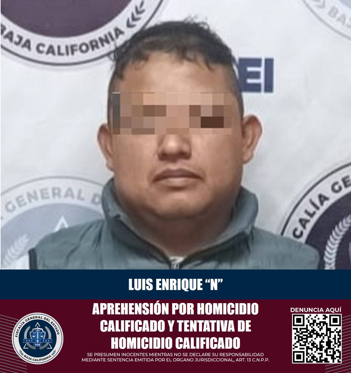 TIJUANA, B.C. La Fiscalía General de Baja California informa que, como resultado del importante trabajo de coordinación que se realiza entre instancias de procuración de justicia en el país, el 14 de febrero de 2024, elementos de la Agencia Estatal de Investigación en Tijuana, lograron capturar al imputado Luis Enrique “N”, quien contaba con orden de aprehensión activa por los delitos de homicidio calificado y tentativa de homicidio calificado en la Ciudad de México.