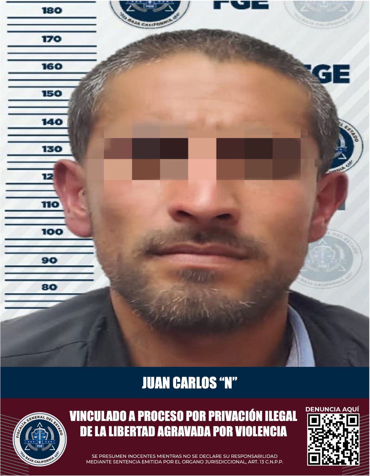 MEXICALI, B.C. La Fiscalía General del Estado, a través de la Unidad de Investigación Foránea de Ciudad Morelos, integró la carpeta de investigación con las pruebas suficientes para que el Ministerio Público encargado del caso, las ofreciera ante el juez y se obtuviera la vinculación a proceso de Juan Carlos “N”, por el delito de privación ilegal de la libertad agravada por violencia.