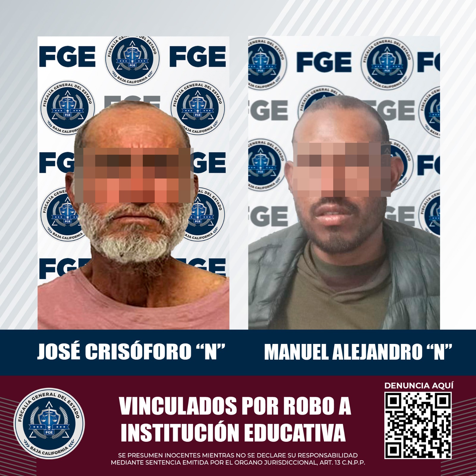 MEXICALI, B.C. La Fiscalía Regional de Mexicali, a través de la Unidad de Investigación con Detenidos Poniente, logró el inicio de un proceso penal en contra de dos hombres que fueron relacionados con el delito de robo equiparado a institución educativa.