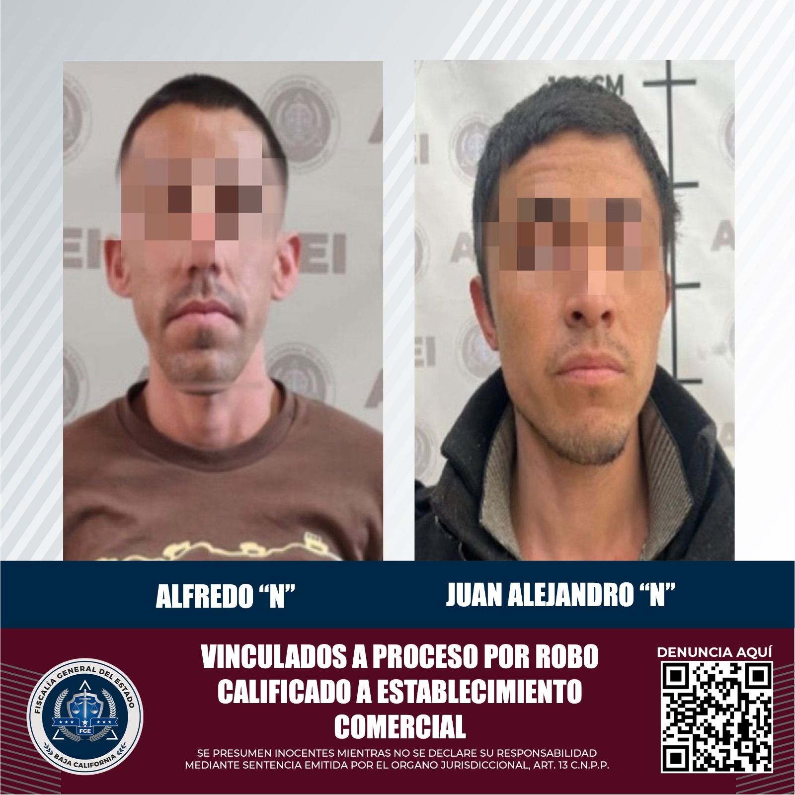 MEXICALI, B.C. La Unidad de Investigación de Robos Oriente de la Fiscalía Regional de Mexicali, obtuvo la vinculación a proceso de Alfredo “N” y Juan Alejandro “N”, quienes presuntamente cometieron el delito de robo calificado a establecimiento comercial abierto al público con violencia.