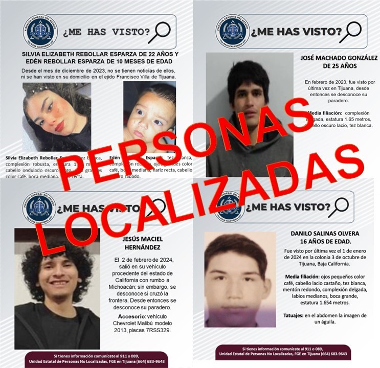 TIJUANA, B.C. El personal de la Fiscalía General del Estado ha logrado ubicar a cinco personas que habían sido reportadas como desaparecidas. Entre ellas se encuentran una mujer y su hijo de 10 meses de edad, y tres hombres, quienes fueron encontrados con buen estado de salud.