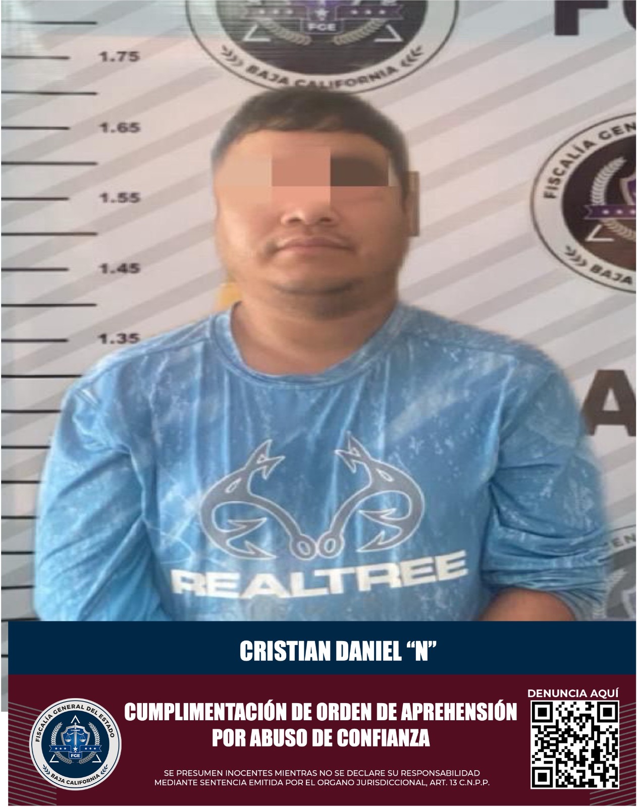MEXICALI, B.C. La Unidad de Investigación de Delitos Contra el Patrimonio, Estado, Sociedad y Justicia, de la Fiscalía General del Estado, cumplimentó una orden de aprehensión a Cristian Daniel “N”, por el delito de abuso de confianza.