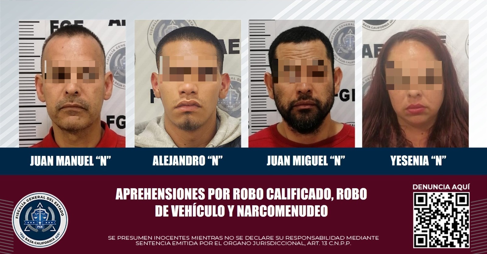 TIJUANA, B.C. La Fiscalía General del Estado informó sobre la captura de cuatro individuos, sobre quienes pesaban órdenes de aprehensión, por su presunta implicación en delitos de robo calificado con violencia, robo de vehículo, robo simple y narcomenudeo. Estas detenciones fueron llevadas a cabo por elementos de la Agencia Estatal de Investigación.