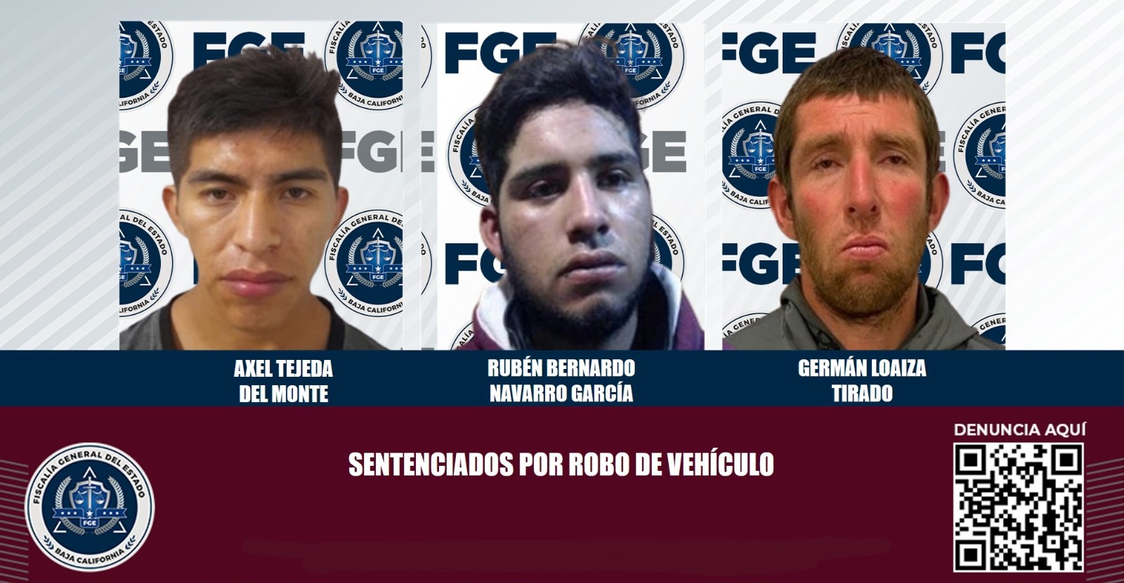 TIJUANA, B.C. Tras el desarrollo de diversas acciones de investigación, mediante las cuales se recabaron datos de prueba, la Fiscalía Regional de Tijuana, logró que tres hombres fueran sentenciados por el delito de robo de vehículo, de los cuales dos de ellos participaron en un mismo hecho delictivo.