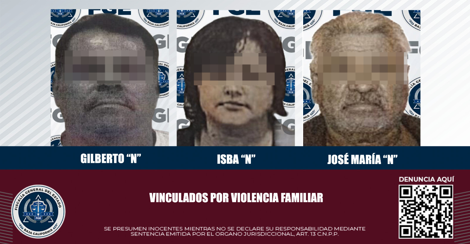 ENSENADA, B.C. En atención a denuncias por el delito de violencia familiar, la Fiscalía General del Estado obtuvo la vinculación a proceso de dos hombres y una mujer, logrando además que se impongan medidas cautelares en cada uno de los casos.